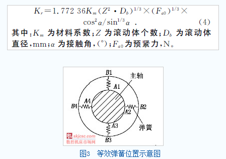 軸承支撐參數的識別有多種方法,如傳遞函數法、直接法等,本文利用已有經驗公式計算角接觸軸承的剛度。主軸軸承采用定位預緊方式,在已知預緊力的情況下,可近似求得角接觸球軸承的徑向剛度Kr: