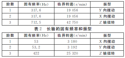 由表1和表2可知,長軸的臨界轉速遠小于空心短軸的臨界轉速。加工時的轉速在3000r/min,空載轉速為3500r/min,而長軸的低階臨界轉速是3180r/min和3192r/min,由此可知,長軸加工時可能會發生較大振動,而短軸的臨界轉速遠大于實際轉速,避免了產生共振的可能。
