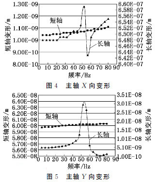 諧響應分析是研究物體受到一定頻率范圍內激振力時產生的變形和應力變化情況,研究對象主軸所受到的約束條件與模態分析相同,施加載荷為60N·m的轉矩。分別以長軸和短軸前端一點進行位移變形的數據采集,采樣間隔4Hz,在轉矩載荷0Hz~80Hz試驗區間均勻得到20個采樣點。采樣頻率處的計算數據連接成如圖4、圖5所示的曲線,可以分析主軸在該頻率區間受載荷下的變形情況。