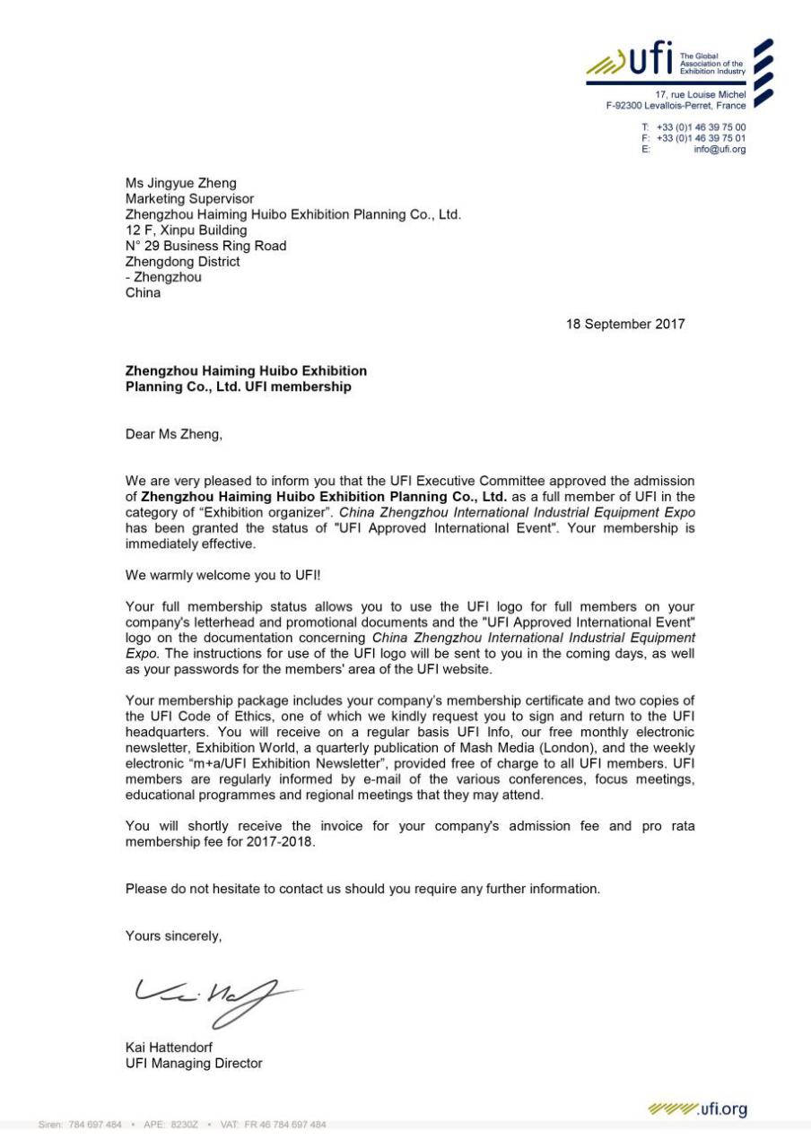 2017年9月13日,UFI(全球展覽業協會)巴黎總部傳來喜訊:中國鄭州國際工業裝備博覽會(簡稱“鄭州工博會”)正式通過UFI認證,展會承辦方鄭州海名匯博會展策劃有限公司也通過UFI評審委員會的表決,正式成為UFI會員單位。