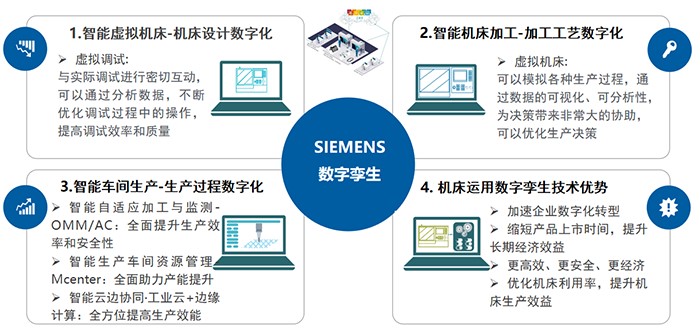 西門子主要展出了Sinumerik One和Sinumerik 828D數(shù)控系統(tǒng),840D系統(tǒng)將于2024年退市。Sinumerik One是以西門子技術(shù)生態(tài)及其數(shù)字孿生工具鏈為依托的“數(shù)字化原生”數(shù)控系統(tǒng),是西門子推動機(jī)床行業(yè)數(shù)字化轉(zhuǎn)型的關(guān)鍵產(chǎn)品,具有創(chuàng)建相應(yīng)數(shù)字化雙胞胎的多功能軟件,以實(shí)現(xiàn)機(jī)床制造和生產(chǎn)過程數(shù)字化孿生。其智能化功能包括:智能動態(tài)控制(IDC)、智能負(fù)載控制(ILC)、Top Speed plus智能功能。