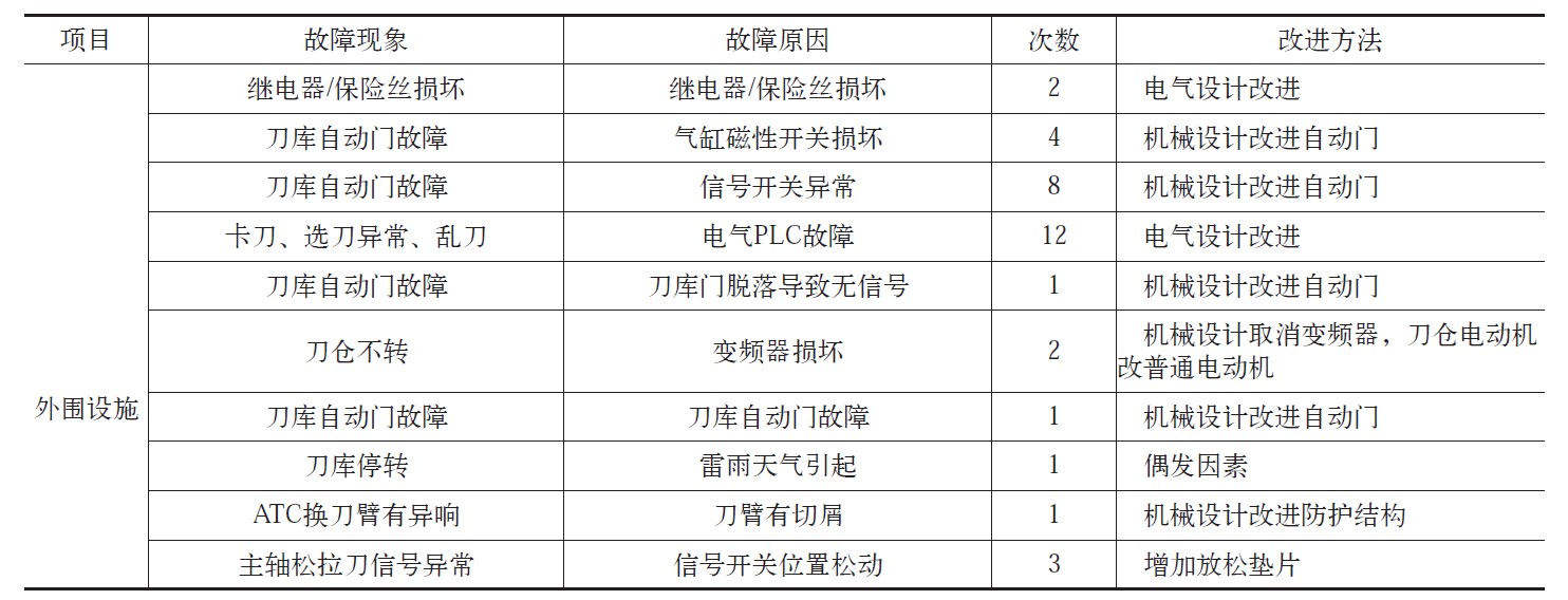 由表1統計可知,刀庫自身問題引起的故障總數為52起,占比41.93%,在刀庫故障總量中占據了最大份額。由此可見,刀庫自身可靠性的提升將極大促進機床整體可靠性的提升。上述故障中,針對刀倉部分主要需要改進刀倉上信號開關的安裝、增加鎖緊結構,同時需要改進帶動刀倉旋轉的電動機上的剎車裝置;ATC機構改進點較多,主要故障點為換刀機構和凸輪箱,根據故障次數,建議刀庫廠家將對刀臂和凸輪箱進行整體考量,從結構上更換品牌。