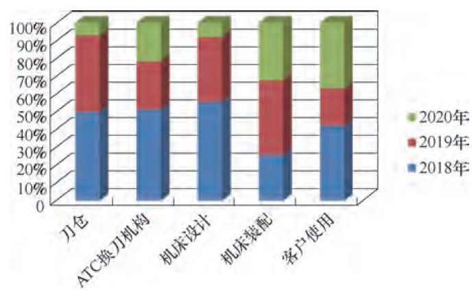 根據圖5的數據,進一步得出2018—2020年刀庫故障因素比重統計,如圖6所示。隨著刀庫可靠性改善工作的推進,刀庫自身問題和機床設計在刀庫故障中的占比越來越小,機床裝配和客戶使用不當造成的故障占比越來越高,必須更加注重對裝配制造質量的控制。