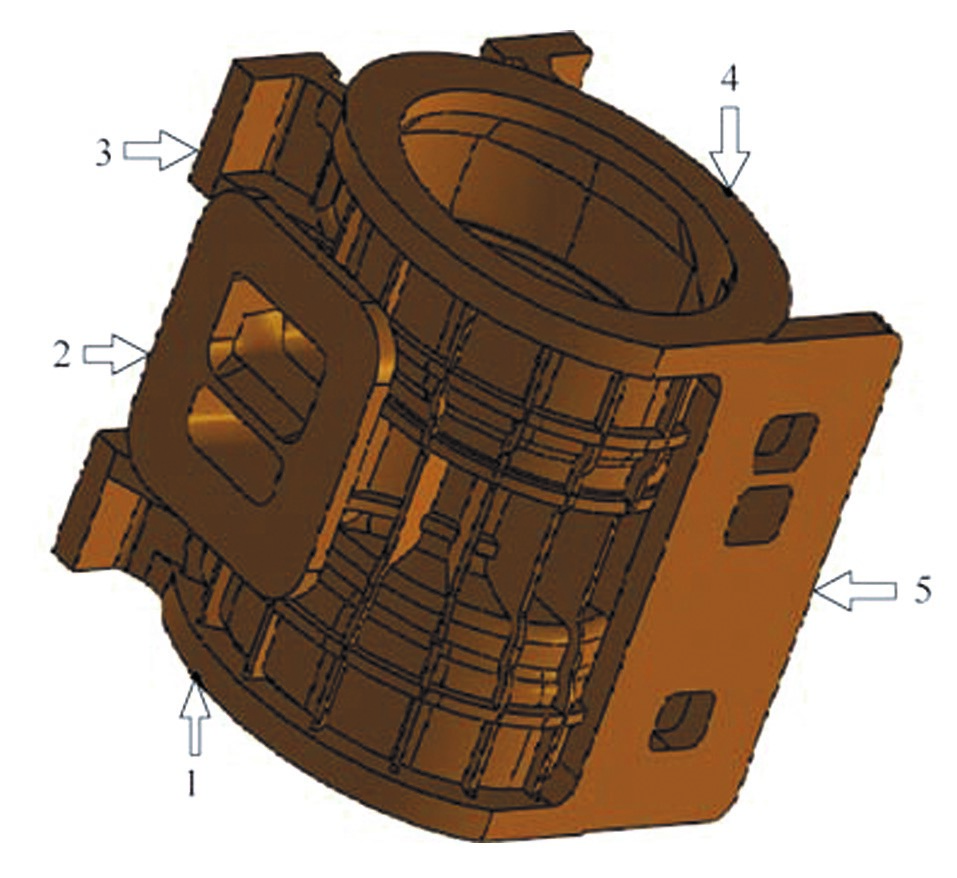 圖2 泵體立體圖 (1.下法蘭 2.入口法蘭 3.泵腳4.上法蘭 5.出口法蘭)