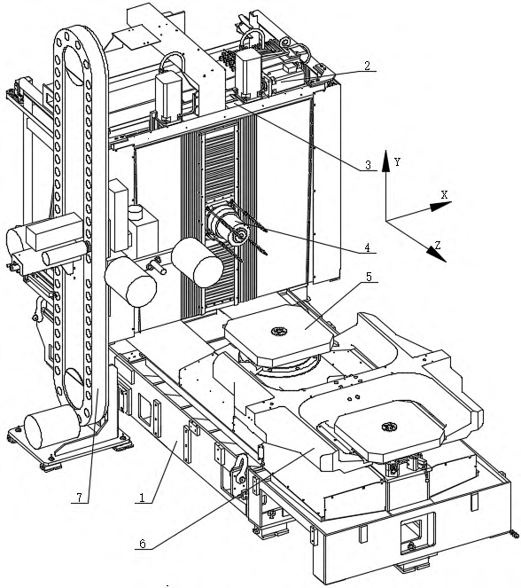 1.床身部 2.立柱部 3.滑鞍部 4.主軸部 5.工作臺部 6.交換站部 7.自動換刀系統