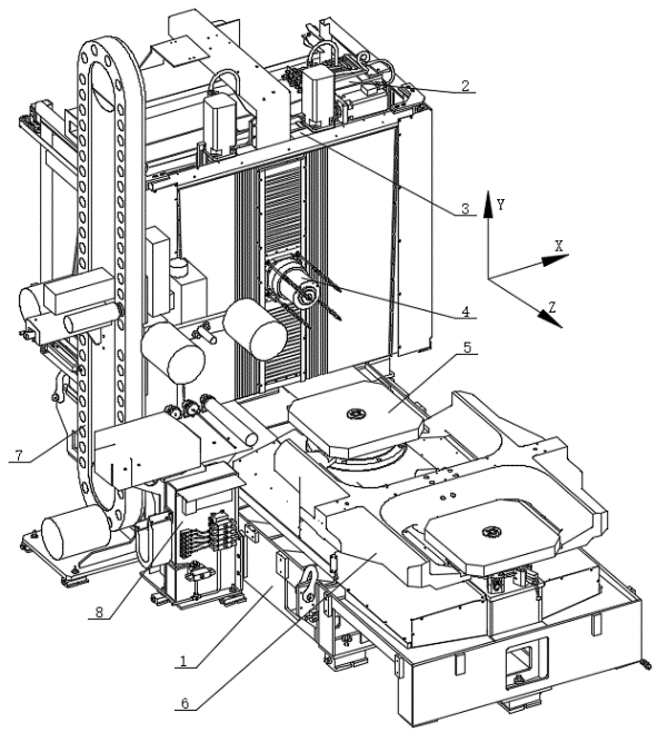 1.床身部 2.立柱部 3.滑鞍部 4.主軸部 5.工作臺部 6.交換站部 7.自動換刀系統 8.輔助換刀系統