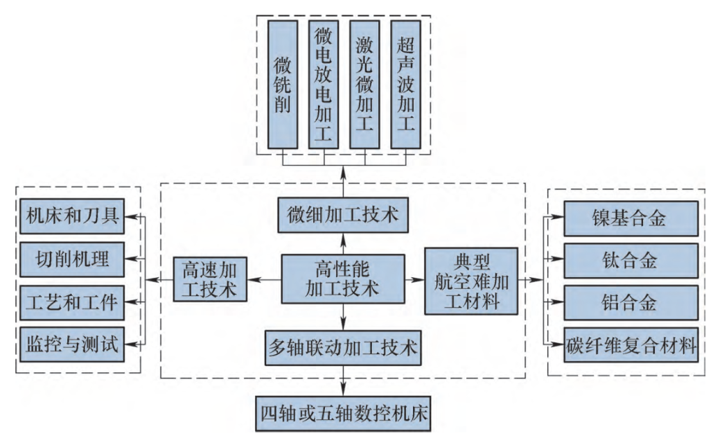 高性能加工技術是一種工程技術,融合了高速加工技術(HSM)、多軸聯動加工技術、微細加工技術和難加工材料工藝技術等關鍵要素,旨在提高材料加工效率、精度和性能,其框架如圖1所示。在航空航天領域,這些技術用于制造高要求零部件,以應對復雜性和可靠性要求,推動著該領域的制造技術不斷進步。