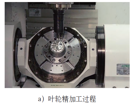 在具體的應用研究方面,FAN等開發了一種專門用于離心葉輪的五軸加工方法,該方法將葉輪分割成不同的區域,優化刀具路徑以實現精確、高效的銑削。MHAMDI等開發了航空發動機葉片Ti-6Al-4V多軸銑削動態模型,在葉片制造中實現了更好的精度和表面質量,解決了復雜的形狀和材料挑戰。陳凱航開發了一種葉輪五軸聯動數控加工的半實時速度規劃方法,有效提升了加工質量和效率,滿足了工程實際需求。以半開式整體葉輪為例,多軸聯動加工現場及樣件如圖3所示。