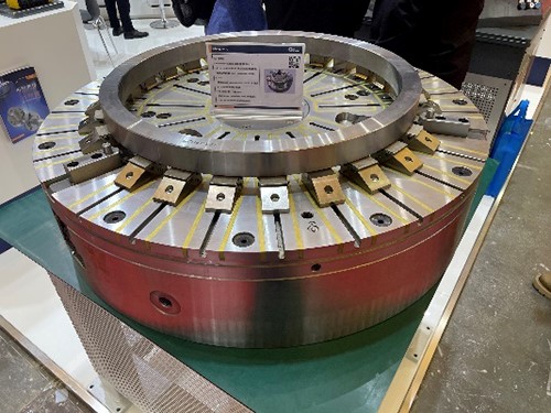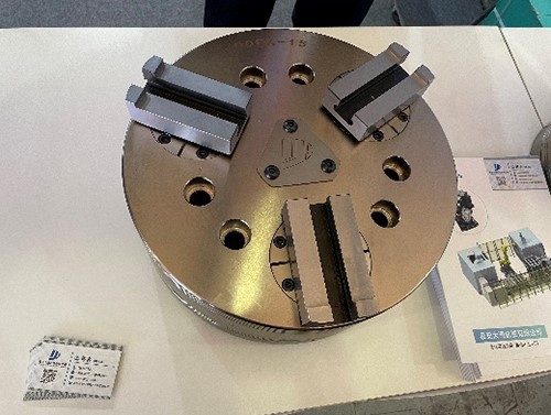 呼和浩特眾環工貿股份有限公司作為國內卡盤行業的開拓者,是國內最先接觸和生產動力卡盤的企業之一,產品線十分豐富,涵蓋手動卡盤、傳統的楔式動力卡盤和各行業專用卡盤。本次展會帶來了為某重點用戶定制的前置式管螺紋浮動補償液壓卡盤,卡盤內置集成液壓缸,且帶有快速夾緊行程,同時配置有浮動夾持卡爪和夾緊力補償系統。作為非標行業專用卡盤,其整體復雜的結構和豐富的功能體現了企業的技術能力,從企業給出的宣傳參數上看,已能達到國外同類產品的水平,但在卡盤的生產加工能力和工藝理念上看仍存在進步空間。