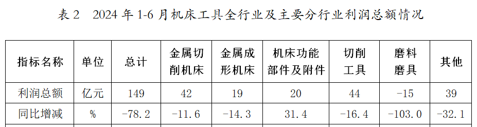 表2 2024年1-6月機床工具全行業及主要分行業利潤總額情況