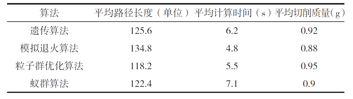 (1)從路徑長度的角度看,遺傳算法在平均路徑長度方面表現(xiàn)出色,平均路徑長度為125.6 單位。這意味著遺傳算法能夠生成相對較短的刀具路徑,有助于提高加工效率。粒子群優(yōu)化算法和蟻群算法也表現(xiàn)良好,平均路徑長度分別為118.2 單位和122.4 單位,略低于遺傳算法但仍然在可接受范圍內(nèi)。模擬退火算法在這一指標(biāo)上稍遜一籌,平均路徑長度為134.8 單位,略高于其他算法。因此,如果追求更短的路徑長度是首要目標(biāo),遺傳算法可能是最佳選擇。