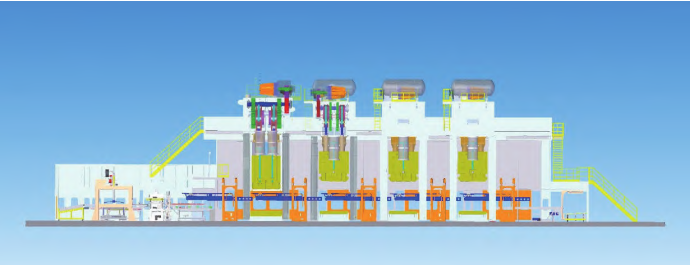 大型快速高效全自動沖壓生產線是集機、電和液于一體的大型沖壓設備,代表了當今國際沖壓技術的最新發展趨勢。隨著更新換代速度的日益加快,汽車工業呈現出生產規模化、車型個性化及車身覆蓋件大型化和一體化的特點。為了滿足這種發展需求,高精度、高效率和柔性化的全自動快速沖壓生產線逐漸成為越來越多的汽車制造商的必然選擇。