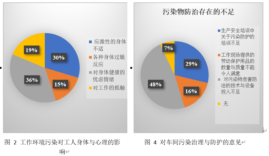 問卷調查結果如圖 1-圖 4所示,工人在機加車間的日常工作中有可能接觸到污染有廢液、固體污染物(切屑、碎渣等)、廢氣與噪音,其中接觸到各種廢液的情況最為常見(見圖 1)。在工作環境接觸污染后,有30%的受訪者反映發生了應激性的身體不適,例如刺激性氣味導致的惡心等,15%的受訪者則表示會出現各種過敏反映,例如接觸廢液后的皮膚刺痛以及由異味導致的咳嗽等,在污染環境中工作導致對身體健康產生憂慮情緒甚至是抵觸工作的受訪者分別達到了36%與19%(見圖 2)。約57%的受訪者表示目前生產環境中污染物防護的措施主要是配備勞動保護用品,建立規章制度在生產工作中對各種操作進行規范以避免污染危害的占到了22%,表示所在單位通過采用自動化技術以及建立規章制度以降低工人直接接觸污染物風險的受訪者則僅有18%(圖 3)。在另一方面,受訪對象也普遍表達了對進一步改善生產環境的期待,受訪者普遍指出的問題中,“用于污染物防治的技術與設備的投入不足”占48%,“培訓不足”占29%,“勞動防護用品的數量與質量不能令人滿意”則占16%(圖 4)。