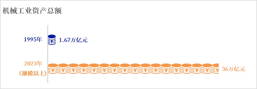 新中國成立之初,機械工業企業數量為3119家,此后數量持續增加,多種所有制經濟共同發展。截至2023年末,機械工業規模以上企業(主營業務收入2000萬元以上)數量已達到12.1萬家,約占全國工業規模以上企業數量的四分之一。職工人數由1949年的10.7萬人,增至2023年規模以上企業從業人員約1870萬人,累計增長174.8倍,占全國工業職工人數的24.1%。資產總額由1995年有記錄以來的1.67萬億元,提高至2023年的36萬億元,累計增長21.6倍,年均增長11.6%。