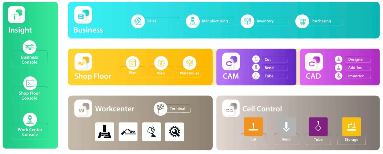 其中,百超中國為板材行業(yè)推出的開創(chuàng)性軟件解決方案一一BySoft Suite,助力用戶的業(yè)務(wù)從報價到交付實(shí)現(xiàn)完全數(shù)字化全流程。BySoft Suite做倒了可擴(kuò)展現(xiàn)有大部分用戶使用的BySoft軟件產(chǎn)品,其出Insight監(jiān)控中臺系統(tǒng),Business業(yè)務(wù)管理系統(tǒng)、Shop Floor車間管理系統(tǒng)、CAD設(shè)計系統(tǒng)、CAM編程系統(tǒng)以及Cell Control單元管理系統(tǒng)6個軟件產(chǎn)品系列組成,用戶可以在他們的業(yè)務(wù)流欄中每個階段進(jìn)行數(shù)字化監(jiān)控、管理和決策。