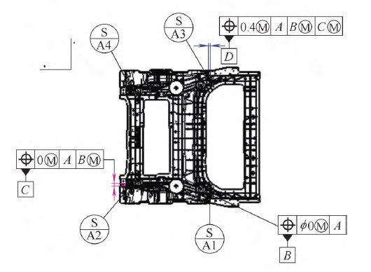 通過RPS點(diǎn)將零件定位在校形檢具上,針對需要控制的形狀、尺寸及位置進(jìn)行校形,使零件滿足尺寸精度要求。