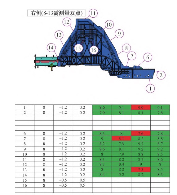 如圖7所示,可以看出綠色部分±0.5mm為合格區(qū)域,紅色及藍(lán)色分別為±2mm偏差區(qū)域,根據(jù)圖示可以看出兩邊輪罩區(qū)域及前部與門檻梁搭接區(qū)域存在嚴(yán)重超差情況。