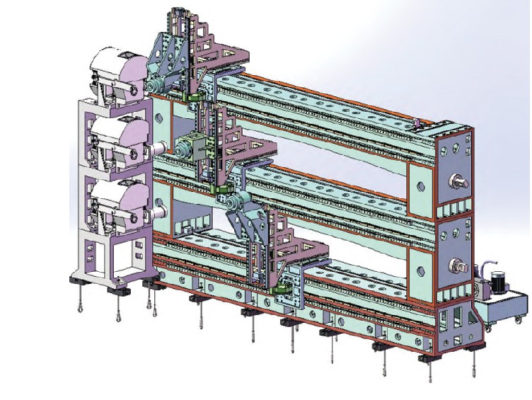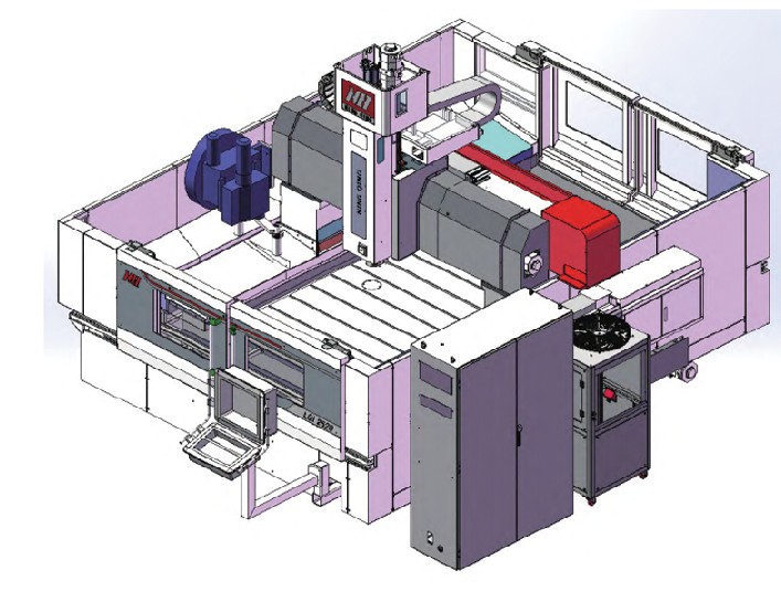 圖3所示新式加工機床由四大部分組成:三單元臥式加工單元、臥式五軸單元、工作臺底板及夾具、桁架自動化送料系統。