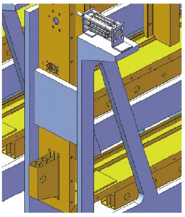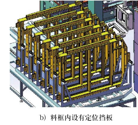 4)整體式底板上方的獨立料框內設有定位擋板,人工將工件放至料框內,同樣采用標準氣缸固定夾緊,通過齒輪齒條驅動,使毛坯件按順序分層前進,配合桁架機械手進行抓取,轉運至被加工區域。