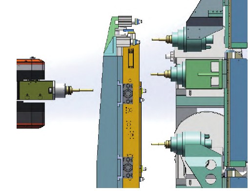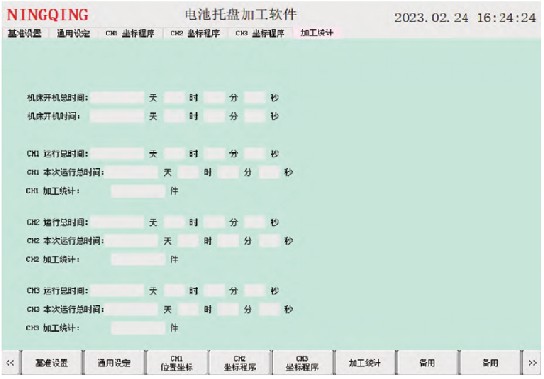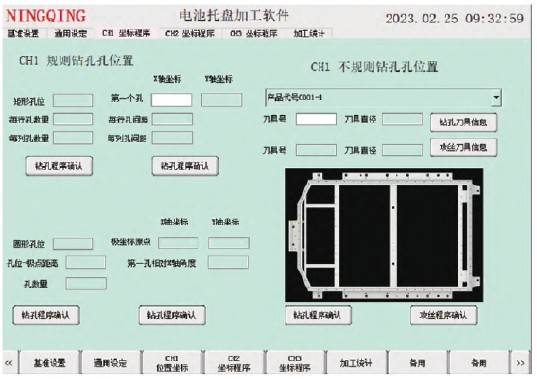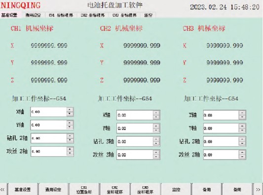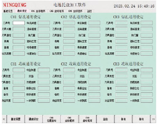 此機床采用定制化數控系統界面,僅需要輸入孔的位置,即可調整規格品種的程序,鉆孔攻螺紋的參數可以在后臺程序調節。該系統可實現多通道控制,每個臥式通道負責加工產品的一部分。通過定制化軟件,有效將工件分成3部分,每部分由1個臥式通道完成,大大提高了加工效率。