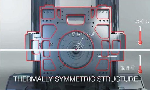圖中下半部為初始溫度狀態(tài),上半部為環(huán)境溫度和主軸溫度升高的狀態(tài)。機(jī)床結(jié)構(gòu)盡管發(fā)生熱變形,但主軸中心(刀具中心點(diǎn))可以保持不變,稱(chēng)之為“熱親和”設(shè)計(jì)原理。