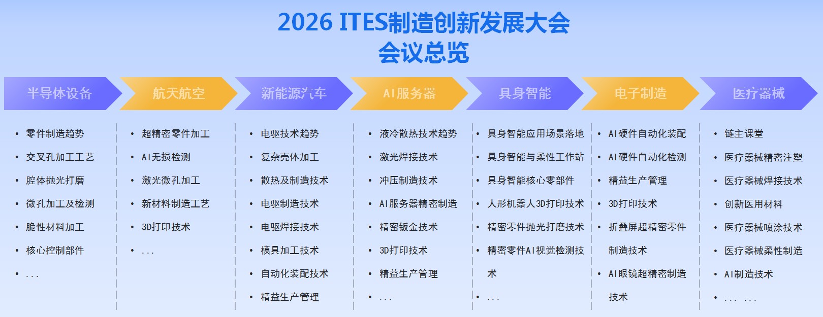 作為2026 ITES“展+會”生態的核心組成,同期系列會議聚焦更行業核心零部件及先進工藝應用,精準覆蓋半導體設備、新能源汽車、AI 服務器、具身智能、電子制造、醫療器械、航空航天7大熱點賽道,打造80余場高質量主題論壇。