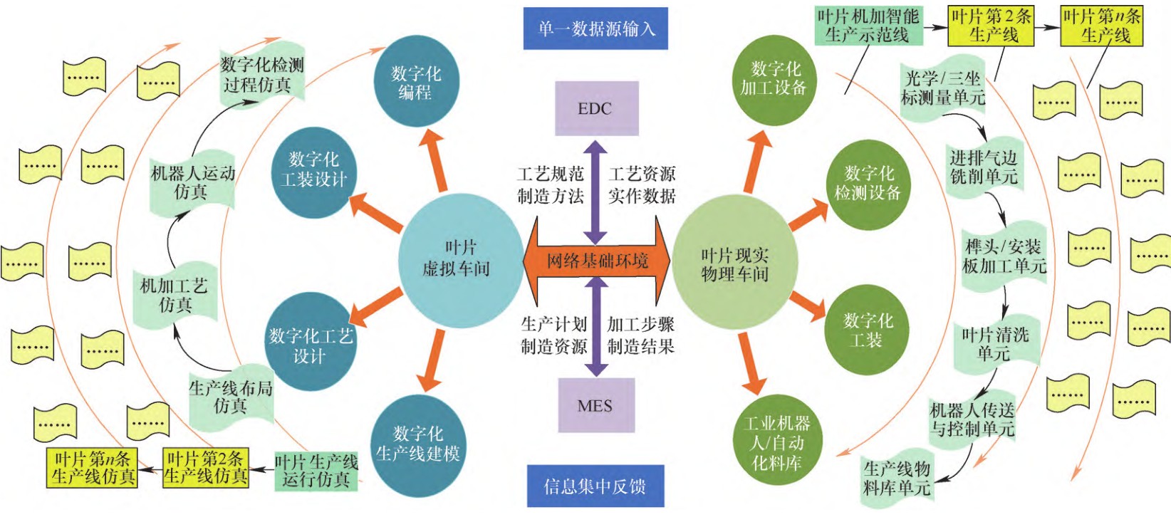 目前,國內航空發動機企業已實現從傳統工藝向數字化加工的轉變,通過集成光學測量、自適應銑削、快換工裝、二維碼標識和SPC控制等技術,將傳統17道工序中的復雜工藝流程優化為2道主要工序的高效工藝流程。采用科學的生產線建模、布局規劃和迭代仿真方法,通過流速、流向和流量分析,滿足了產品的生產要求。在進排氣加工單元和榫根加工單元中,實現了葉片的自適應銑削加工,保證了加工質量的同時,建立了葉片制造過程的質量追溯系統,實現了全流程質量數據的采集與分析,為工藝優化提供了數據支撐,提高了生產線的質量管控能力。