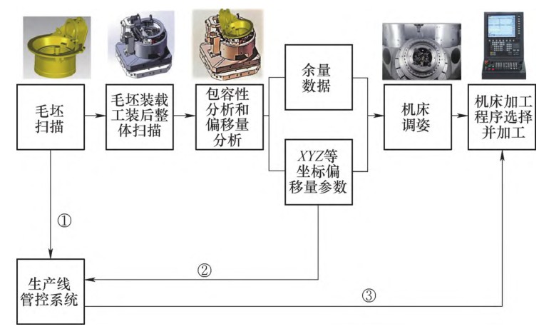國內航空發動機制造企業基于“工況自感知-軟件自決策-機電液自執行”的閉環控制理念,成功實現了具有自主知識產權的殼體工藝裝備智能化組線。該組線創新性地開發了無附加變形的可轉位升降式液壓夾緊與對中定位裝置,集成了自動物流傳輸系統、智能托板庫等智能化單元。同時,通過海量掃描點云的快速配準技術,建立了毛坯測量點集與零件理論模型的空間映射關系,實現了數據驅動的毛坯包容性判定、加工余量均勻優化及定位參數自主辨識。此外,基于自主研發的數控系統與專用刀具,創新性地提出了鉆削、高效插削以及光整側銑的復合加工工藝,顯著提升了殼體的制造效率與表面精度,為航空發動機核心零部件制造能力的提升提供了關鍵技術支撐。殼體類零件毛坯包容性分析與自適應定位如圖3所示。