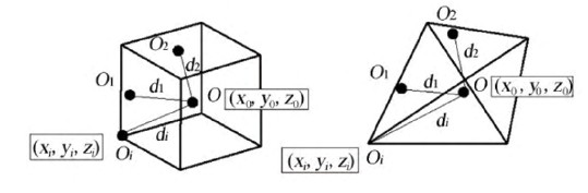 (4)計(jì)算單元內(nèi)點(diǎn)云到中心點(diǎn)的距離 di的均值和標(biāo)準(zhǔn)差。假設(shè)掃描部件劃分的四面體或六面體單元的中心點(diǎn)坐標(biāo)為(x0,y0,z0),如圖2所示。